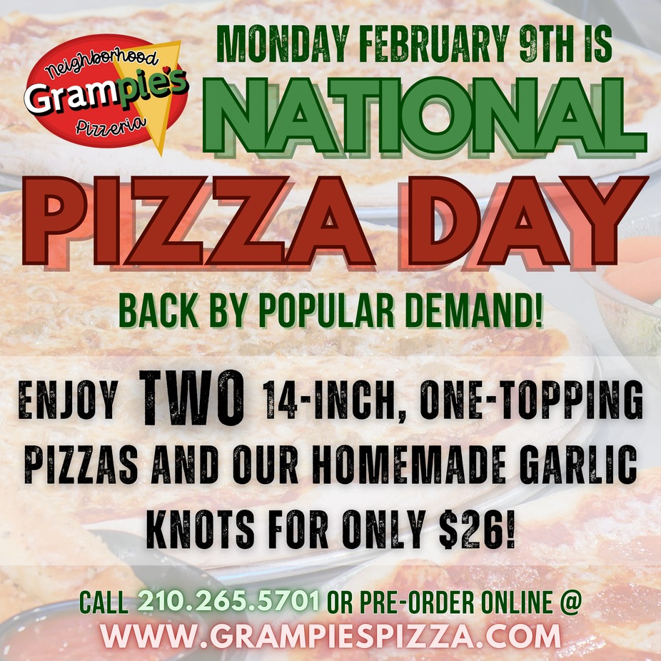 Best. Day. Ever. Celebrate National Pizza Day at Grampie's by grabbing a seriously good offer AND getting a chance to win Grampie's prizes! Every purchase includes a giveaway entry, and we'll be drawing five winners for prizes like free apps, pizzas, cash and more!