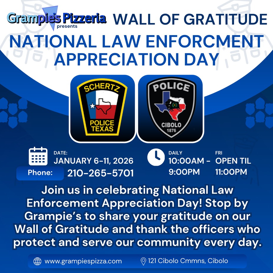 Celebrate with us as we honor local law enforcement. Stop by from January 6th-11th to add a note to our Wall of Appreciation and help thank those who serve our community every day. And on January 9th, officers are invited to enjoy a free slice on us!