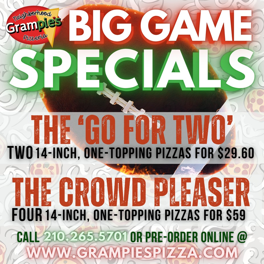 Grab these specials today only! GO FOR TWO Two 14” one-topping pizzas for $29.60 Perfect for couples, small groups, or anyone who believes defense wins championships… but pizza wins hearts. THE CROWD PLEASER Four 14” one-topping pizzas for $59 Because nobody wants to run out of pizza before halftime. Dine in. Take out. Order online.